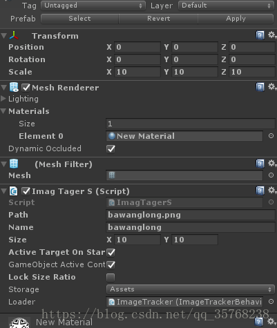 8、单机Hierarchy中的ImageTarget,会在Inspector中出现如下图,设置Path、Name和Size,在Storage处选择Assets。要将GameObject Active打上对勾。且要注意,Loader后面是none改为ImageTarcker。