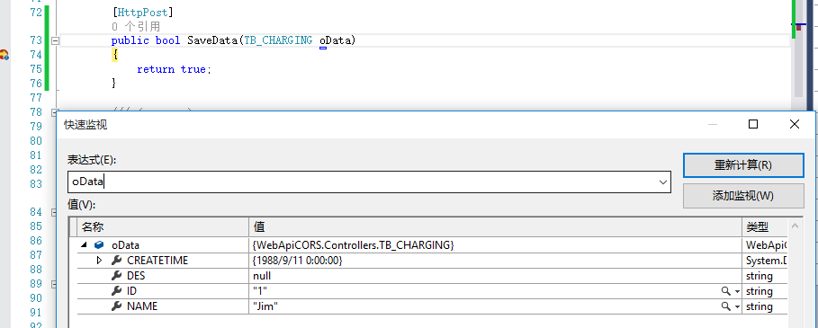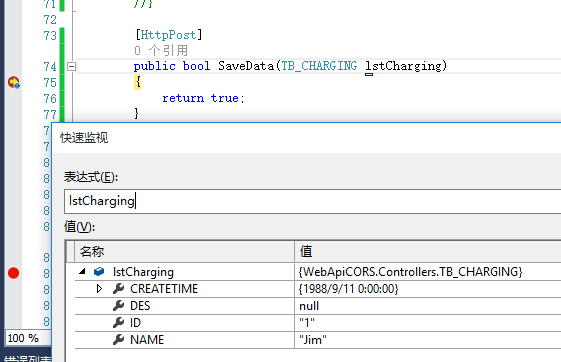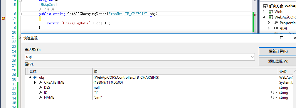 上面我们通过dynamic类型解决了post请求基础类型数据的传递问题,那么当我们需要传递一个实体作为参数该怎么解决呢?我们来看下面的代码便知:
