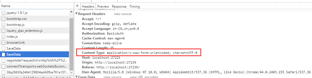 原理解释:使用实体作为参数的时候,前端直接传递普通json,后台直接使用对应的类型去接收即可,不用FromBody。但是这里需要注意的一点就是,这里不能指定contentType为appplication/json,否则,参数无法传递到后台。我们来看看它默认的contentType是什么: