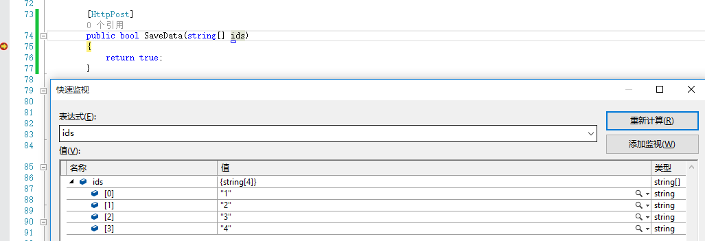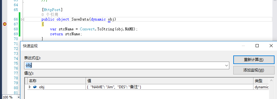 既然上面的办法行不通,那我们如何传递多个基础类型的数据呢?很多的解决办法是新建一个类去包含传递的参数,博主觉得这样不够灵活,因为如果我们前后台每次传递多个参数的post请求都去新建一个类的话,我们系统到时候会有多少个这种参数类?维护起来那是相当的麻烦的一件事!所以博主觉得使用dynamic是一个很不错的选择。我们来试试。