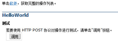 编写2个小方法之后,直接运行就可以如下图,可以看到helloworld方法,点击调用按钮就可以看到返回的数据,也就是自己写死的数据。出现下图也就证明成功写了一个webservice方法。