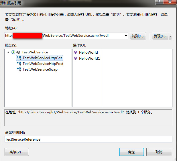 4.我们新建一个web项目叫test1,我们在项目上点击“添加服务引用”,然后把刚才发布的地址+?wsdl添加到地址栏里,点击发布按钮就会看到被调用的webservice,还可以看到方法,命名空间是自己随便起名的,然后点击确定就可以了。