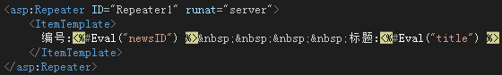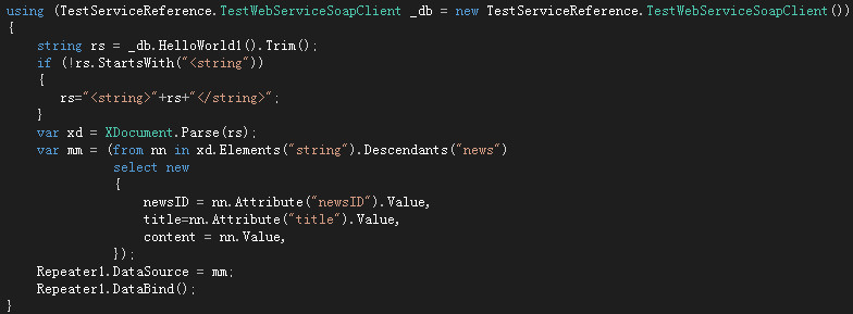 5.在页面调用的例子。建一个WebForm1.aspx,这个页面上添加一个repeater,然后我们在后台调用那个webservice给定数据源即可。