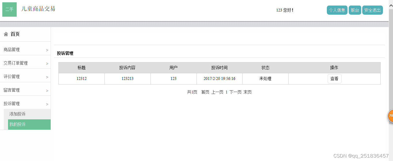 用户:用户具有注册登录、查看商品、购买商品、商品评价、投诉管理以及留言管理,发布商品等功能;