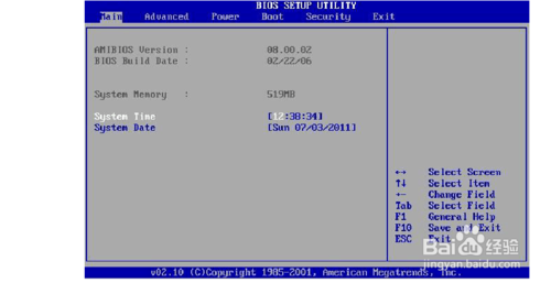 2、进入BOIS界面之后我们可以看到最上方主菜单有6个选项卡,他们分别是Main、Advanced、Pwoder、Boot、Scurity、Exit。