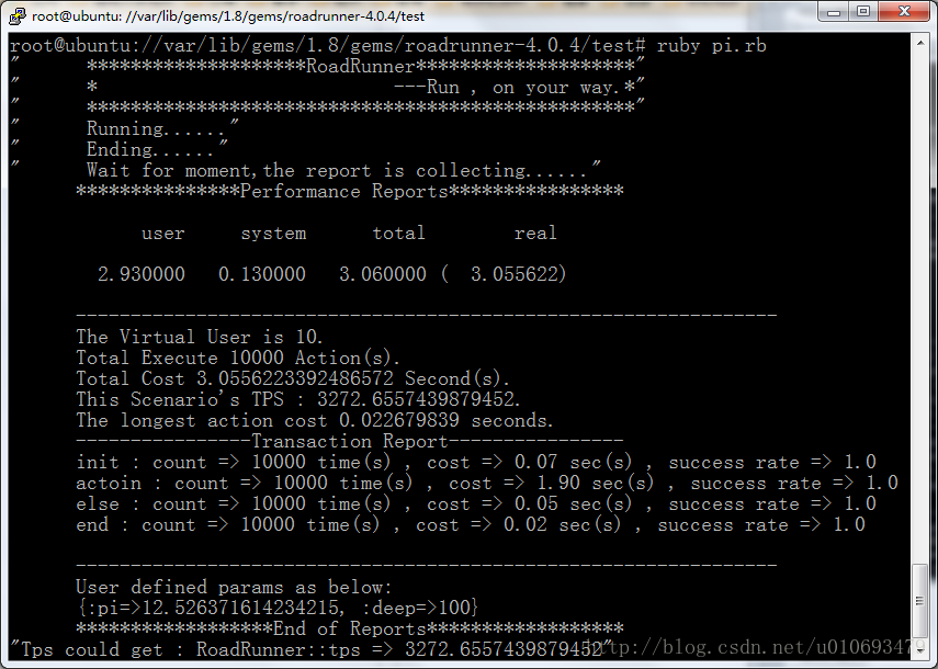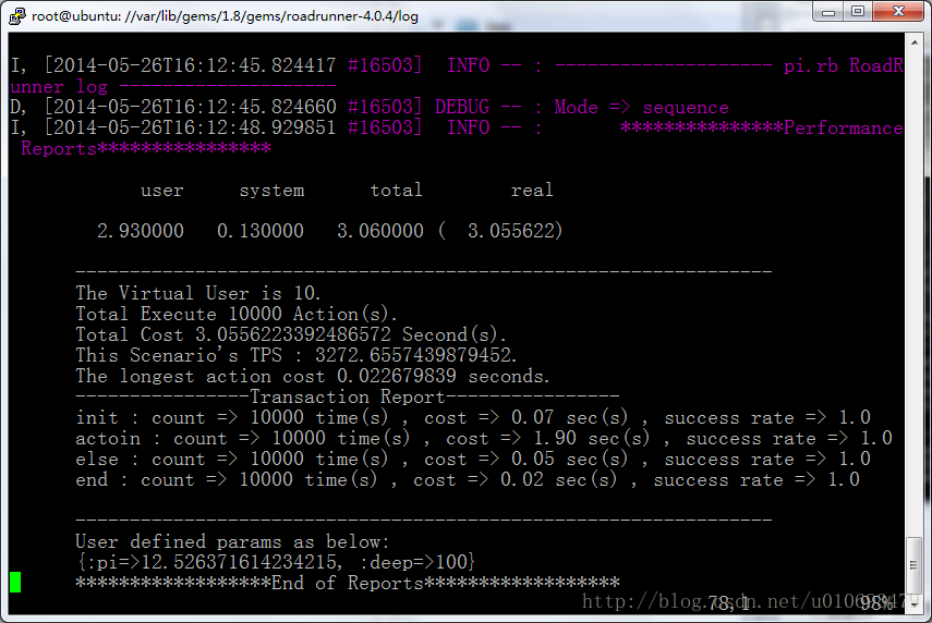 1. 基本功能:设置并发用户数和每个用户执行的次数,对系统进行性能、并发和压力测试,并输出包括响应时间和系统吞吐量(TPS = 并发数/平均响应时间)等指标的报告。在图一中,运行“ruby pi.rb”之后,会在终端显示测试的结果,这是RR提供的最基本的性能测试功能。