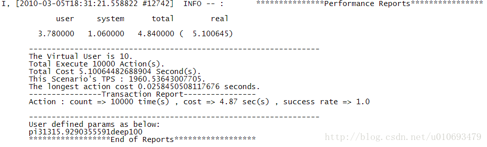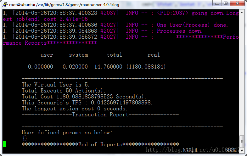 download_process.rb:在进程模式下测试下载一个文件,是并发性能测试的一个例子。这部分的重点是定义了mode = ‘p’,表明测试使用进程模式。init(){ }定义了并发用户数目users和每个用户执行多少次iterations。action(){ }定义了要测试的行为。end(){ }部分没有执行动作。最后调用run和report执行程序和输出报告,然后输出系统TPS。