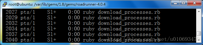 3. 进程模式,使得压力发送的能力只限制于硬件,进程模式是RR的4.0版本添加的功能。test目录下的download_process.rb是进程模式的一个例子。在lib目录里面的run.rb可以看出当程序选择线程模式(t)或者进程模式(p)时的行为。当mode定义为进程模式的时候,RoadRunner将产生最真实的压力。如图四,上图是在运行download_process.rb的时候,在终端运行“ps -x”可以看到的有多个进程在运行;下图是运行测试例子后输出的日志。