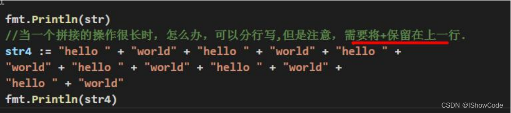 - 当一行字符串太长时,需要使用到多行字符串,可以如下处理