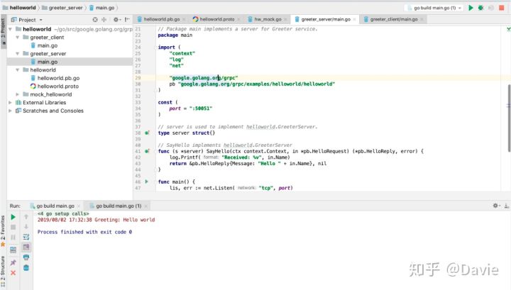通过查看examples目录下的helloworld项目,并分别依次执行greeter_server中的main.go程序和greeter_client中的main.go程序。可以查看到运行结果。项目目录和运行效果如下所示: