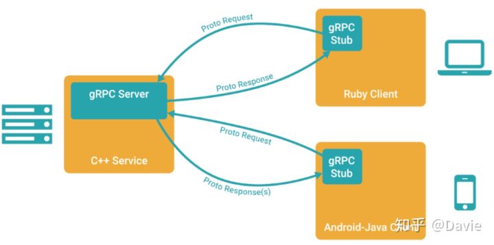 因为gRPC支持多种语言的实现,因此gRPC支持客户端与服务器在多种语言环境中部署运行和互相调用。多语言环境交互示例如下图所示: