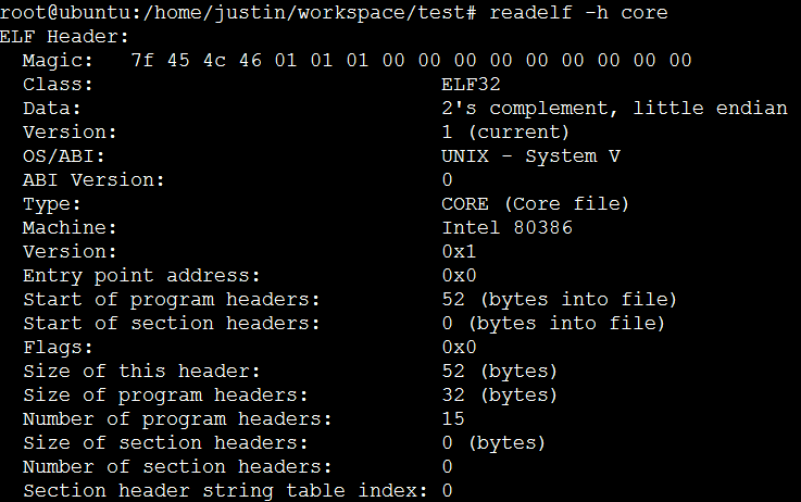 发现core文件类型为ELF格式,使用readelf查看ELF文件头部信息如下
