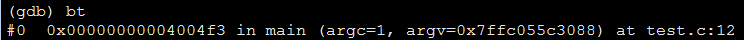 通过bt –n (backtrace)命令可以显示函数调用栈信息,n表示显示的调用栈层数,不指定则打印完整调用栈。因为test.c调试程序不涉及函数调用,所以我们只能看到main函数的栈信息,如果程序是在main函数的字函数中出错,则可以打印更多的调用栈信息。