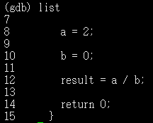 通过list命令可以查看当前指令附近的代码,前提是gdb工具可以找到源代码