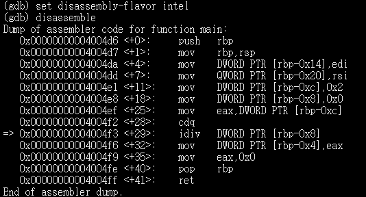 可以看到调用了div指令做除法操作,被除数是-0x8(%ebp),指当前栈基址向下偏移8个字节所在内存单元的数值,EBP是栈基址寄存器。同时我们可以看到前面通过movl $0x0, -0x8(%ebp)将0保存到该内存单元,证明被除数为0。