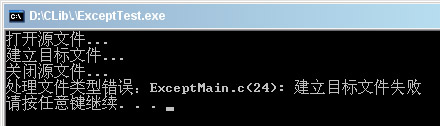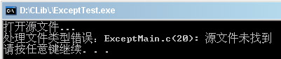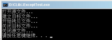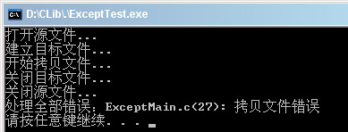 3、修改源文件为错误的路径,FileCopy函数中产生异常,这个异常是在TRY之前抛出的,所以直接被主函数中异常结构中ON_EXCEPT(EXCEPT_FILE_IO)捕获,运行结果为: