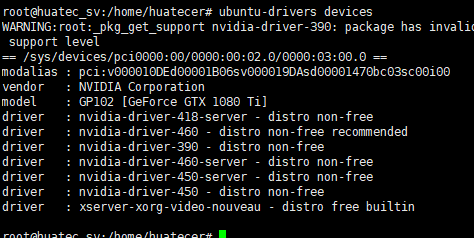 该命令直接告诉你,当前的Ubuntu和当前显卡的组合下,需要什么样的显卡驱动,推荐哪一种。在Ubuntu18.04下,可以安装【418,450,460】,推荐的是460驱动程序。若是在Ubuntu18.04下,查到版本号要低,这是nouveau版本的制约。参考图: