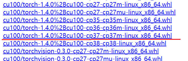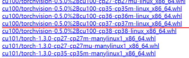 安装pytorch需要知道它的版本和cuda版本对应关系,网上没有整理出来的版本信息,不过,在该下载地址https://download.pytorch.org/whl/torch_stable.html 打开后,安装文件的名称能够反映出cuda版本、python版本,和pytorch对应关系,如: