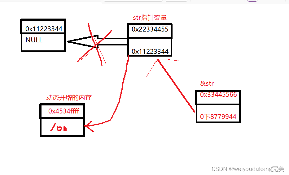 把str的地址取出来给GetMemoy函数,使得改变str的指向,这样出了Getmemoy这个函数,str也能指向动态开辟的内存,这样一来就可把字符串拷贝到str了