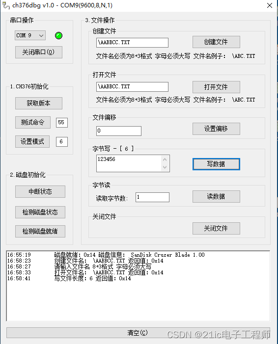 选择串口按步骤进行选择,查看COM口号,打开串口,然后获取版本号,第一部分很重要,由于CH376有多种模式,串口方式、SPI方式、U盘方式、SD卡方式等等。在这里需要设置模式6,属于外接U盘方式。