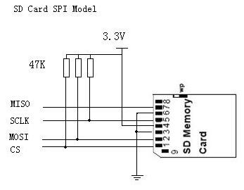 spi下电路的连接非常简单,接上电源线Vdd和地线Vss,再接上spi的CS,SCLK,DI(MOSI)和DO(MISO)就可以了,其他引脚可以 放空。注意SD卡的电源和操作电压都为2.7-3.6V,5V的单片机要进行电平转换或串电阻限流。