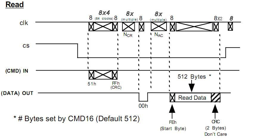 2.向SD卡写入一个CMD或者ACMD指令的过程是这样的: 首先使CS为低电平,SD卡使能;其次在SD卡的Din写入指令;写入指令后还要附加8个填充时钟,是SD卡完成内部操作;之后在SD卡的Dout上接受回应;回应接受完毕使CS为低电平,再附加8个填充时钟。