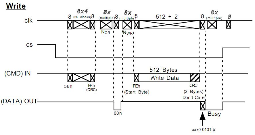 SD卡用CMD24和CMD25来写单块和多块,参数的定义和读操作是一样的。