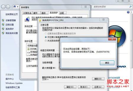 Win7系统打开系统保护时提示"文件目录名或卷标语法不正确(0*8007007B)且"还原系统设置和以前版本的文件"为灰色,C盘为英文命名,如图:
