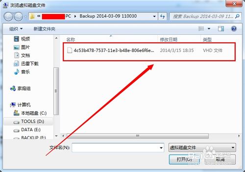 在加载VHD文件界面,选择VHD文件,一般放在文件“WindowsImageBackup”里面,选择文件,点击“确定”。