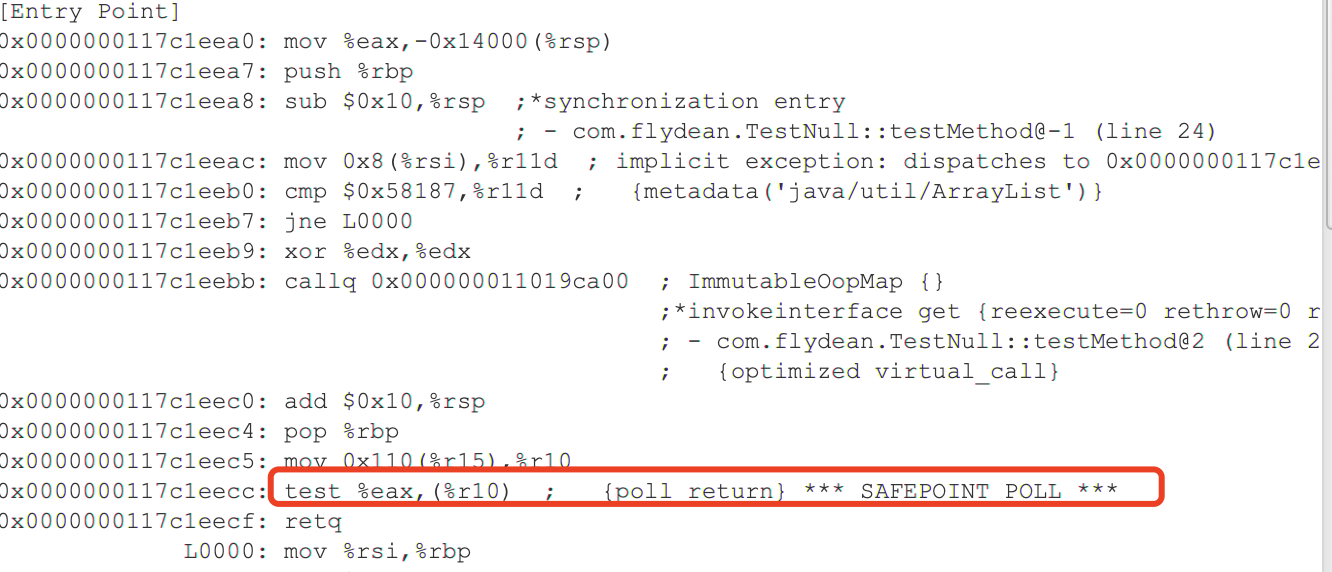 我们可以看到生成的汇编语言中safepoint其实是一个test命令。