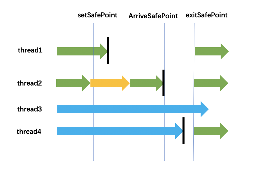 thread1在收到设置safepoint之前是一直执行的,在收到信号之后还会执行一段时间,然后到达Safepint暂停执行。