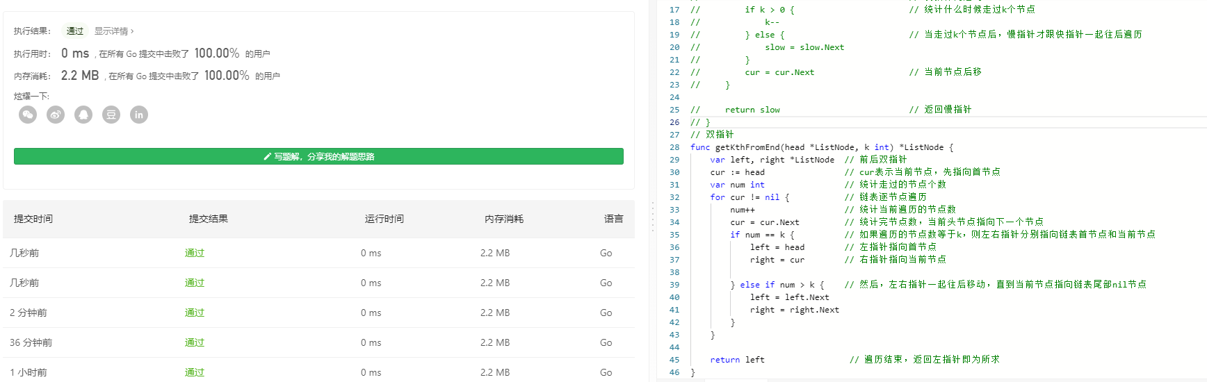 1. 声明left,right两个指针为ListNode的指针类型(这样不用判断k是否大于链表长度,直接返回遍历结束时left指向的链表即为结果);