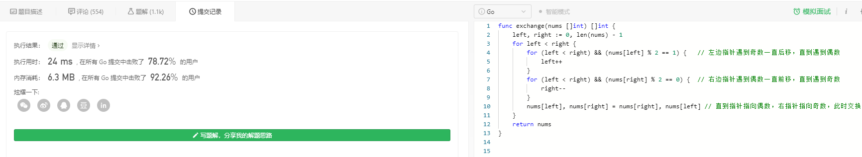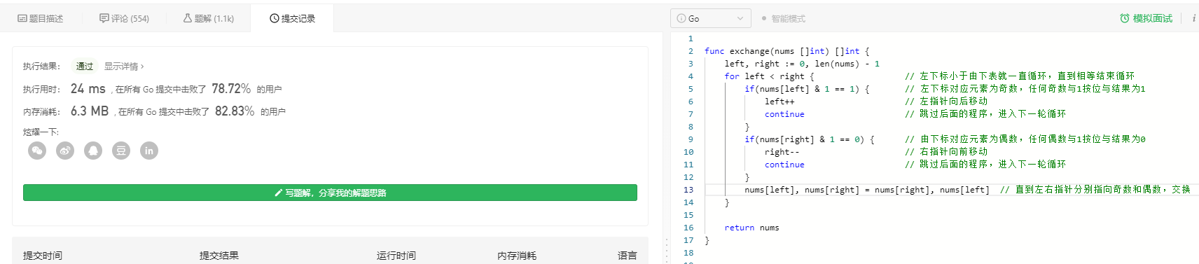 nums[left], nums[right] = nums[right], nums[left] // 直到左右指针分别指向奇数和偶数,交换