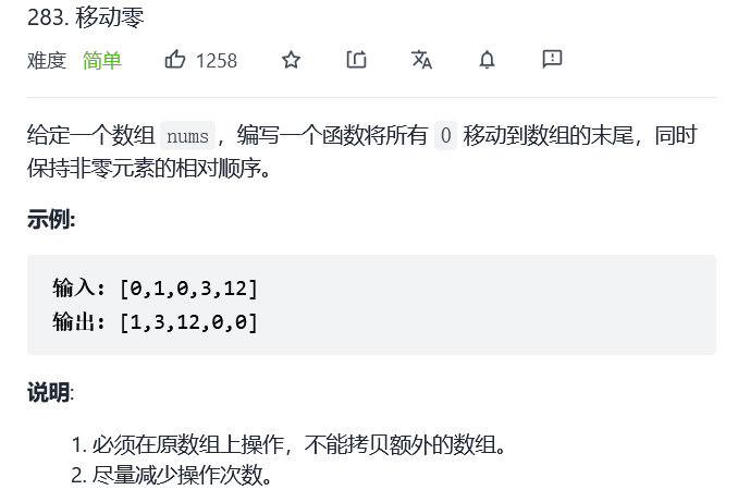 右指针不断向右移动,每次右指针指向非零数,则将左右指针对应的数交换,同时左指针右移。