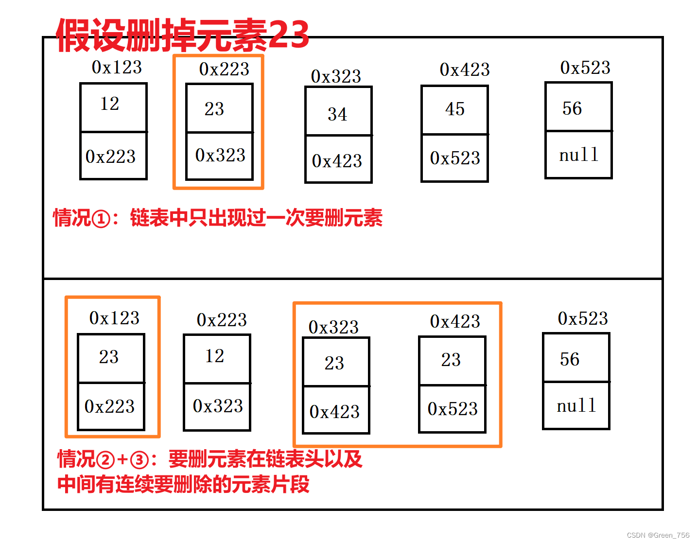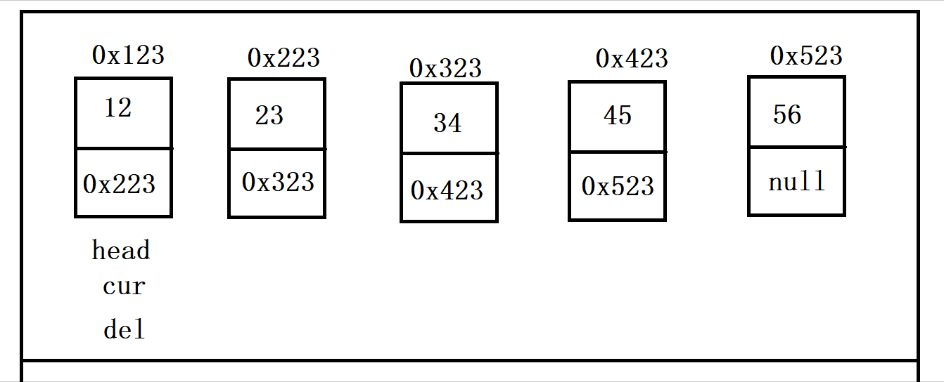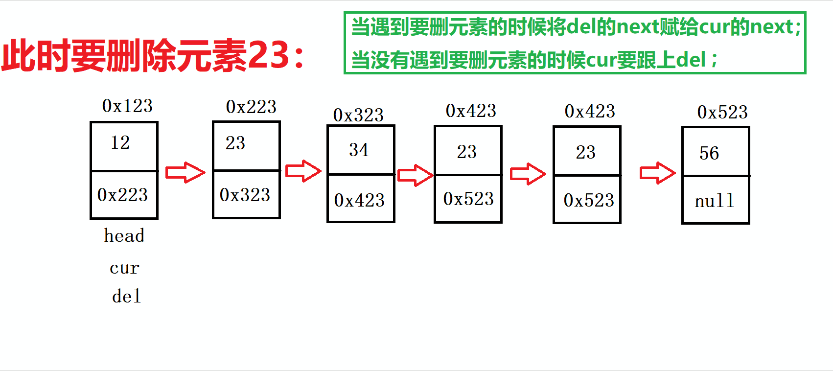 情况①相对来说是较好解决的,我们只需要用到两个变量,创建两个节点,一个命名为del,另一个命名为cur,del作为探针的角色,然后cur紧随其后,当del探到了要删的元素,便将cur的next变为del的下一个节点,就如下图一样????: