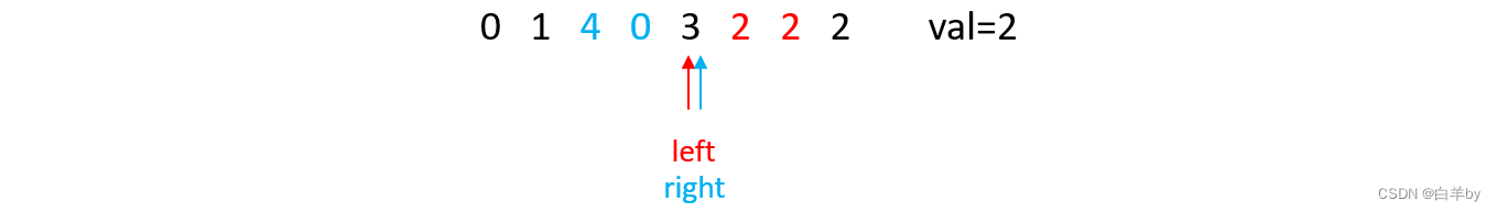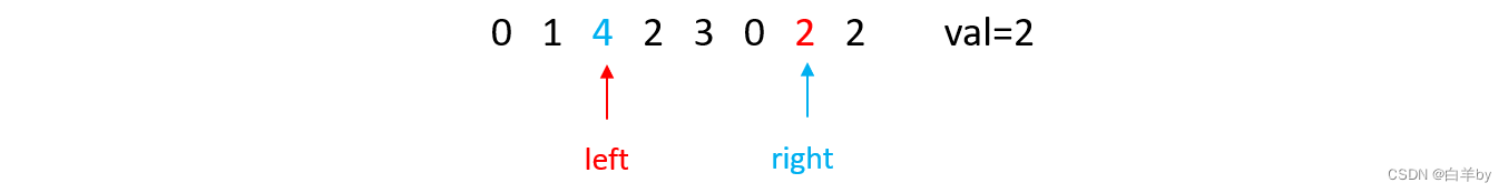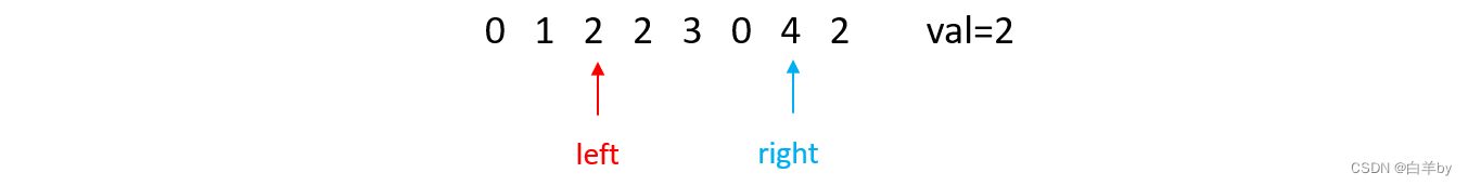 让我们对具体情况进行分析,对于示例2:nums = [0,1,2,2,3,0,4,2], val = 2,首先设置左右指针