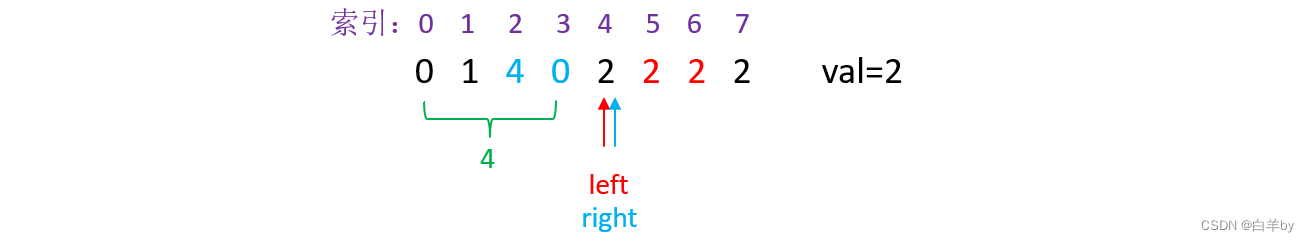 如果当前元素为2,则链表中不为2的元素有4个,而当前左右指针所指元素的索引值正好为4,所以直接返回当前元素的索引值