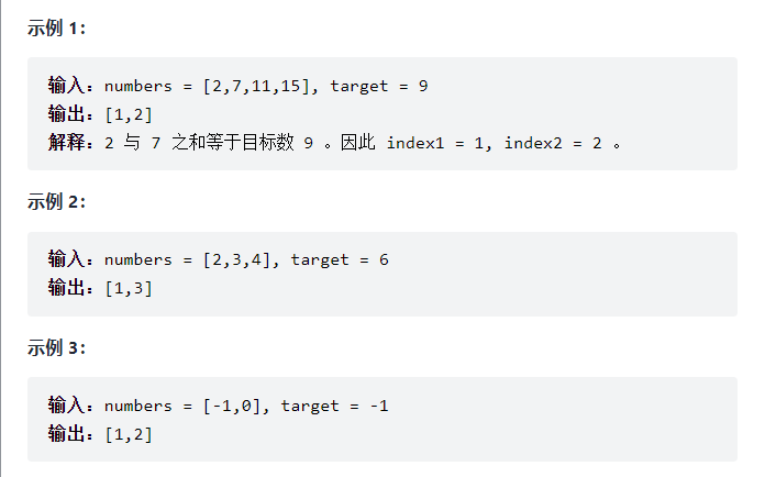 函数应该以长度为 2 的整数数组的形式返回这两个数的下标值。numbers 的下标 从 1 开始计数 ,所以答案数组应当满足 1 <= answer[0] < answer[1] <= numbers.length 。