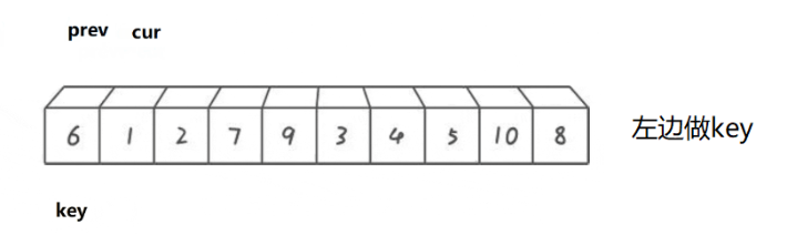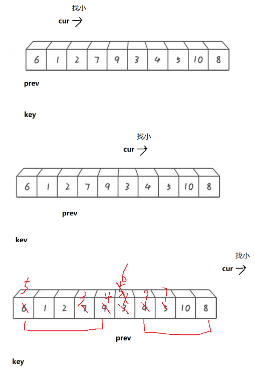 思路:定义三个变量:prev,key,cur。最初的时候prev指向数组第一个元素,cru指向prev数组的下一个数组,key设定为左边第一个元素的值,此时cur在数组中找比key小的元素,如果找到就,prev++,然后将prev位置上的值与cur位置上的值交换,并且cur++;如此循环往复,知道cur等于数组最后一个元素的下标才停止,最后将key和prev位置的值互换。下面为示意图: