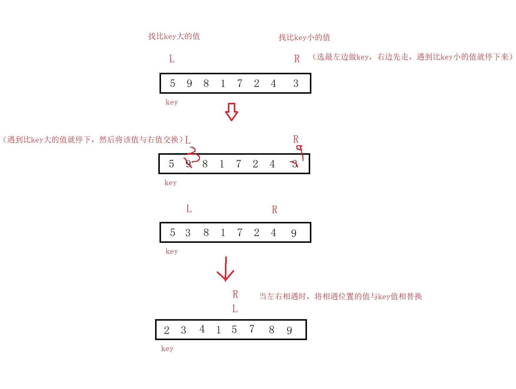 实现hoare版本的快排,需要先实现快排的单趟排序,单趟排序的目标是实现左边的值比key要小,右边的值比key要大。快排的结构图如下所示: