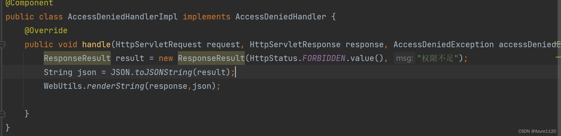 如果是授权过程中出现的异常会被封装成AccessDeniedException然后调用AccessDeniedHandler对象的方法去进行异常处理。