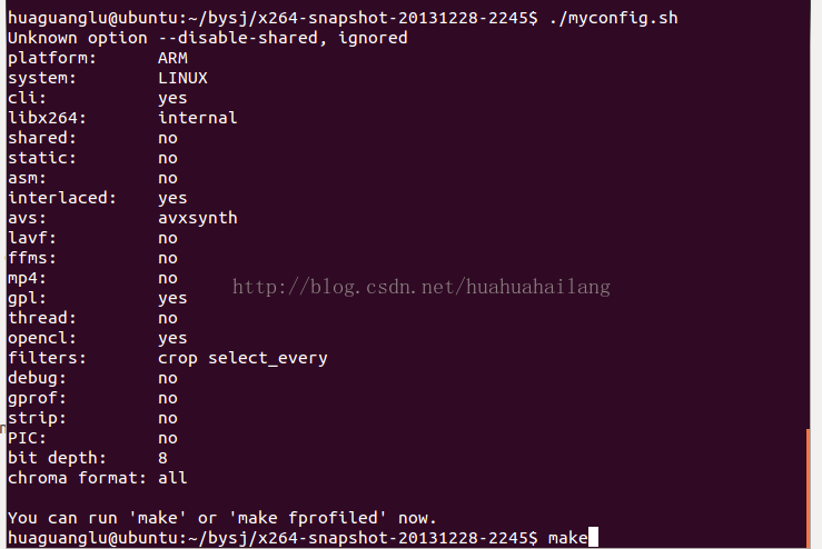 将上面代码复制到myconfig.sh中,终端到~/bysj/x264-snapshot-20131228-2245/目录下,输入命令:./myconfig.sh运行。运行完了之后,输入make。就会在当前目录下生成libx264.a静态库文件。