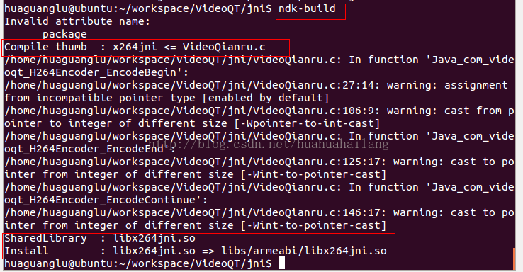 在jni目录下,新建文件VideoQianru.c文件,写jni程序,链接JAVA与C层。然后,终端到jni目录,输入ndk-build,完了之后,就会在VideoQT/libs/armeabi/目录下生成libx264jni.so文件。如图: