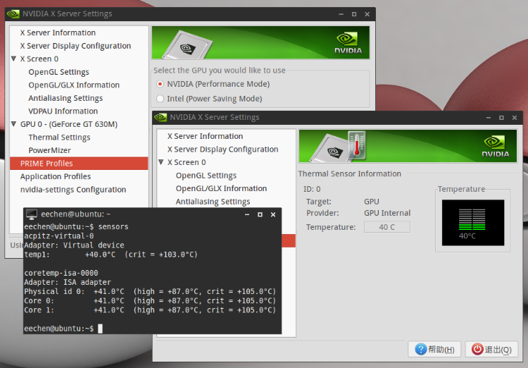 你也可以直接Alt+F2运行 nvidia-settings打开控制面板,比如在Thermal Settings下查看显卡温度,在PRIME Profiles下进行显卡切换。