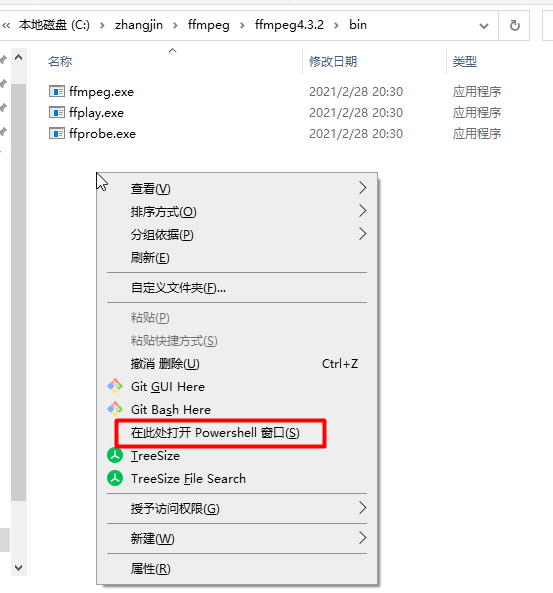 由于文件名比较长,建议将bin和doc两个目录直接复制,粘贴到刚才的下载位置,例如我粘贴的位置是:C:zhangjinffmpegffmpeg4.3.2。打开bin目录,按住shift,同时鼠标点击右键菜单,选择"在此处打开PowerShell窗口”