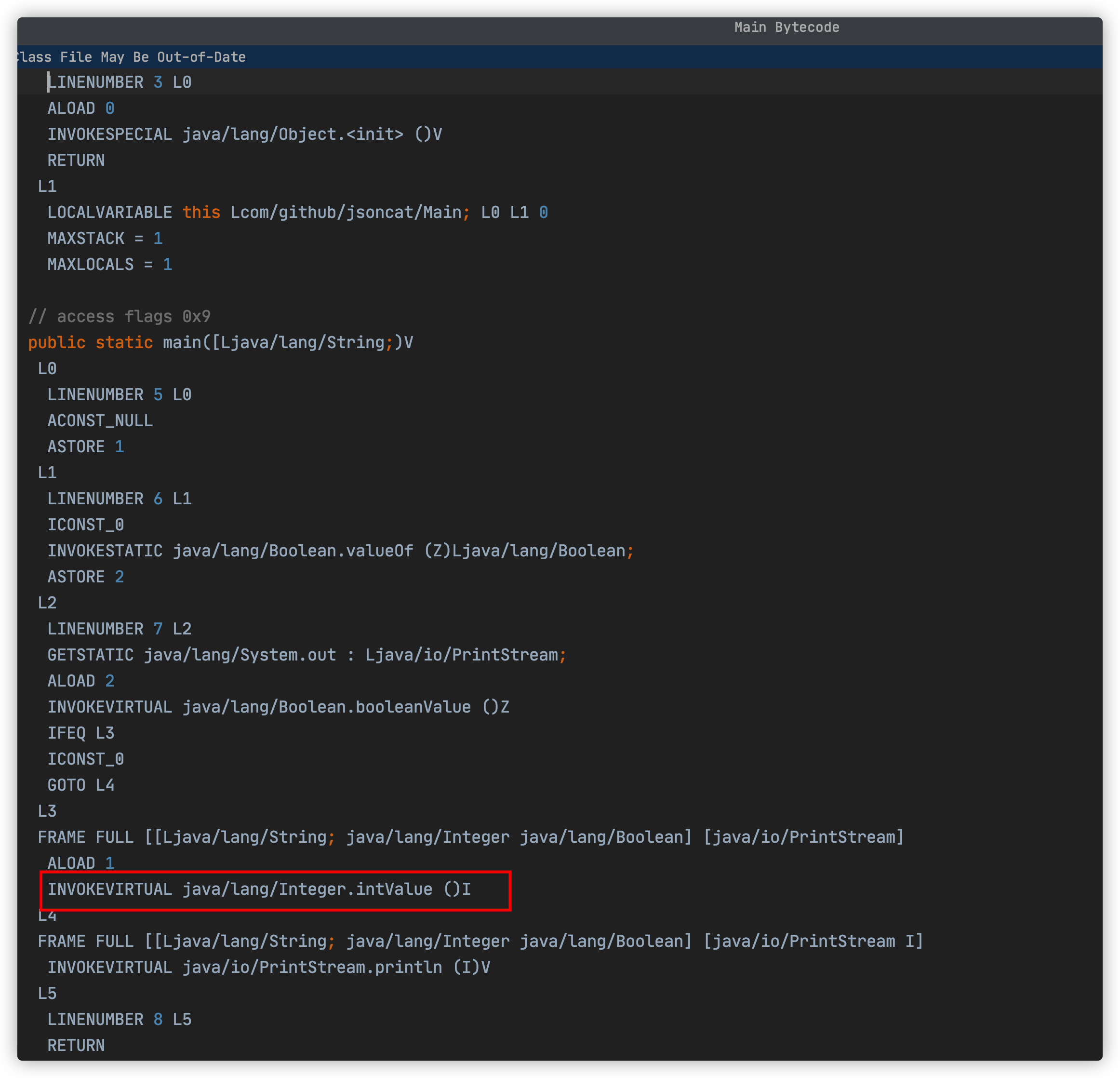从字节码中可以看出,我圈出来的位置发生了 拆箱操作 。