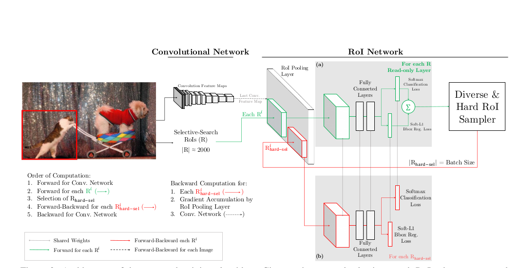 原论文中用的是fast rcnn,在这里我们只说Faster-RCNN。首先通过RPN的前景背景分数找到分数较大的前12000个,然后再进行NMS筛选出2000个rois,这2000个rois不需要通过随机筛选出正负比例是1:3的128个rois,这2000个rois直接经过RoI Pooling层之后得到维度是[2000, 7, 7, 256]维的特征图,送入到上图中的绿色网络中,求出这些rois的loss(注意这些loss是不需要反向传播的),然后再进行排序,将loss排序前128个rois重新送入到红色的网络(其实写代码应该是把这128个rois的loss直接挑出来,加到一起然后作反向回归)。