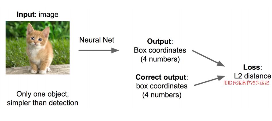 看做回归问题,我们需要预测出(x,y,w,h)四个参数的值,从而得出方框的位置。