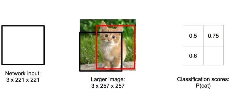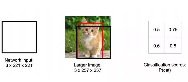 对一张图片,用各种大小的框(遍历整张图片)将图片截取出来,输入到CNN,然后CNN会输出这个框的得分(classification)以及这个框图片对应的x,y,h,w(regression)。