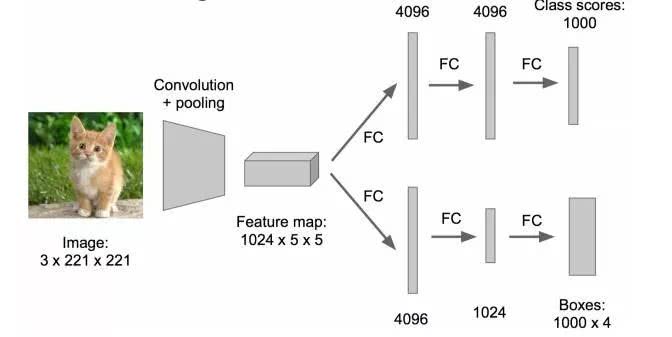 *在上述神经网络的尾部展开(也就说CNN前面保持不变,我们对CNN的结尾处作出改进:加了两个头:“分类头”和“回归头”)
